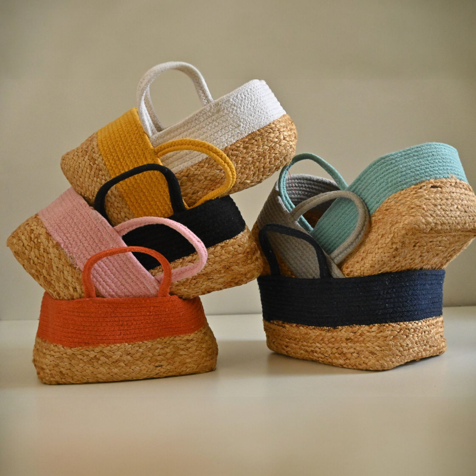 Hand-woven with love, this stylish jute and cotton fabric basket is a perfect blend of rustic charm and modern functionality. Measuring 20 cm in length, 15 cm in breadth, and 10 cm in height, it's the ideal size for a variety of uses.