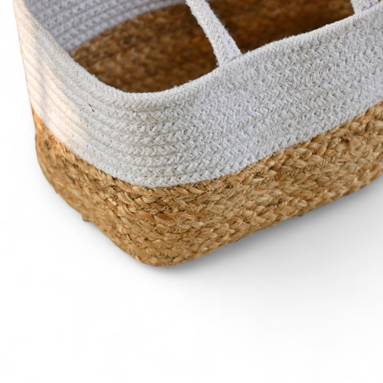 Hand-woven with love, this stylish jute and cotton fabric basket is a perfect blend of rustic charm and modern functionality. Measuring 20 cm in length, 15 cm in breadth, and 10 cm in height, it's the ideal size for a variety of uses.