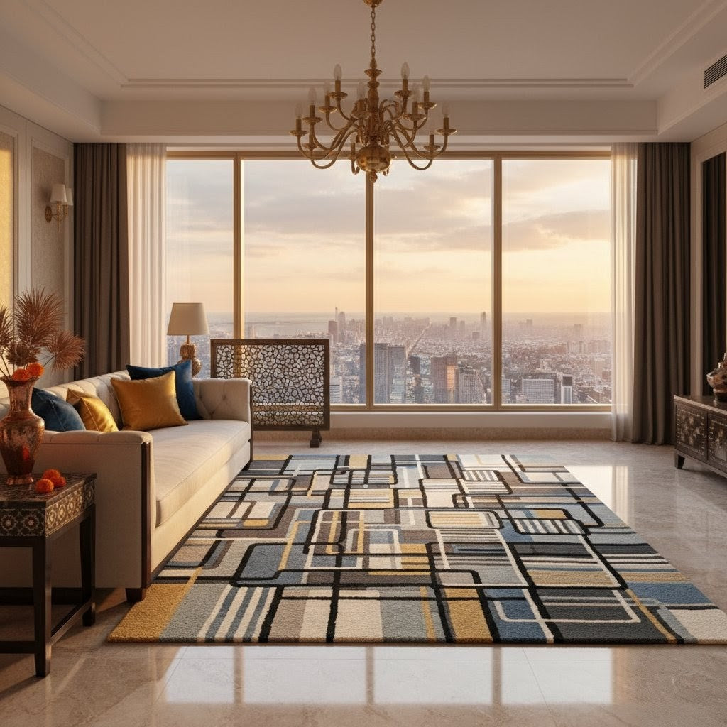 Elevate your living space with the refined charm of Karmakriti’s Handtufted Geometric Wool Rug — where craftsmanship meets contemporary design. Featuring a sophisticated interplay of deep blues, warm mustard, ivory, and charcoal tones, this rug captures the essence of modern artistry while retaining an artisanal soul.
