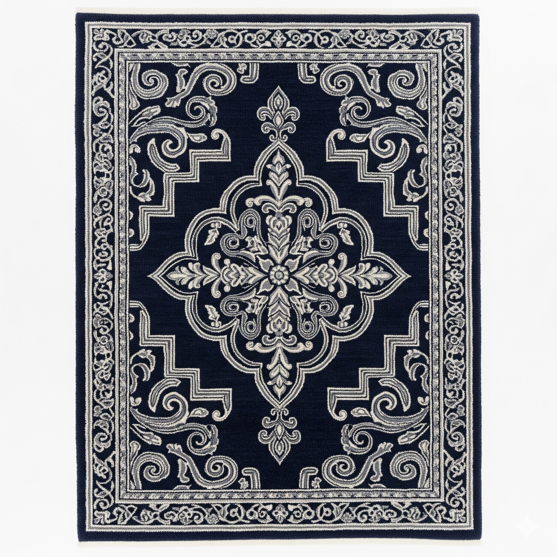 Unveil timeless sophistication with our Noir Elegance Handwoven Wool Rug, where deep navy meets ornate ivory detailing in perfect harmony. Inspired by Baroque artistry, this rug’s symmetrical floral medallion and scrolling border bring a regal yet modern statement to your living space.